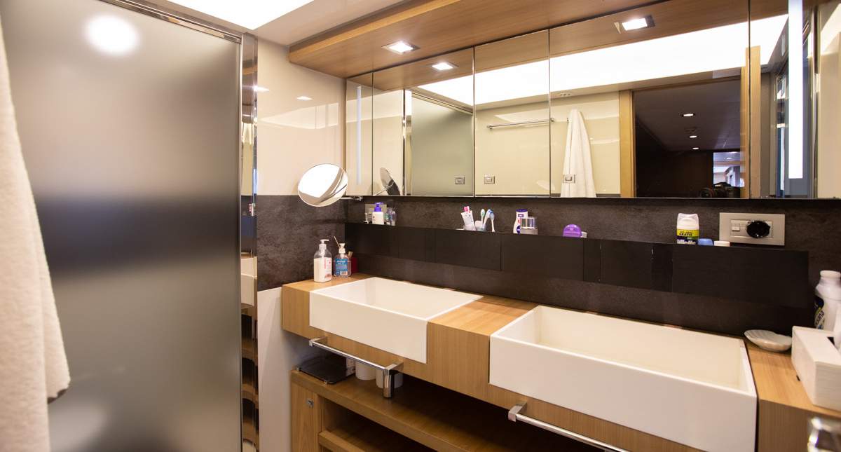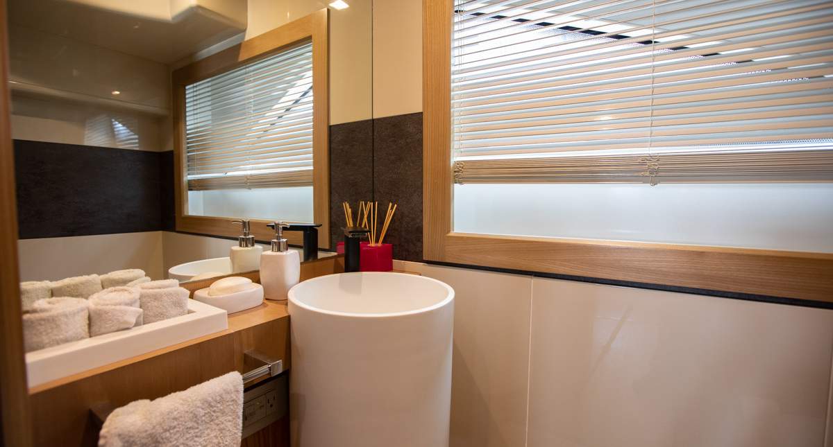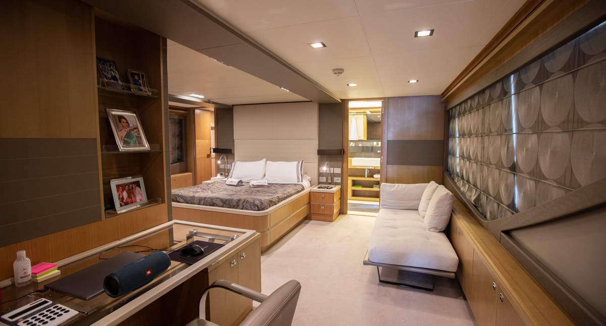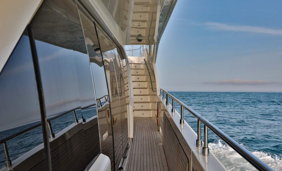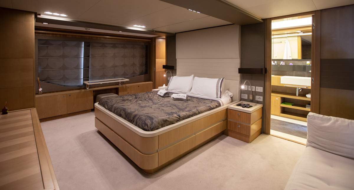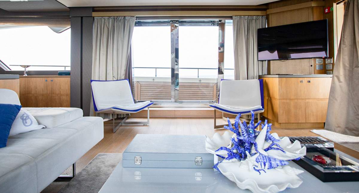 Master cabin on the main deck Hydraulic swimming platform Hydraulic balcony on the main salon Seating area on the bow